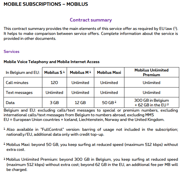 Het dataverbruik wordt berekend per schijf van 1 KB. Wanneer de eenheden begrepen in de bundel opgebruikt zijn, worden de oproepen aangerekend tegen € 0,30/min. en de MB tegen € 0,12/MB. Wanneer het dataverbruik oploopt tot € 60 buiten bundel, wordt de internetverbinding stopgezet tot de start van de volgende facturatiecyclus.