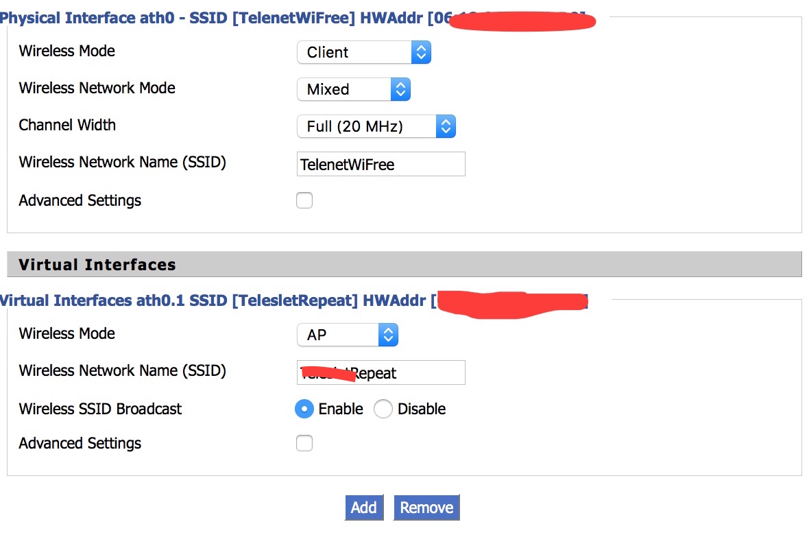 Kies eerst voor Client mode op de wireless en vul de naam in van de hotspot waarmee je je wil verbinden. Let op dat je de spelling exact goed hebt. In mijn geval is het een Fon hotspot van SFR.