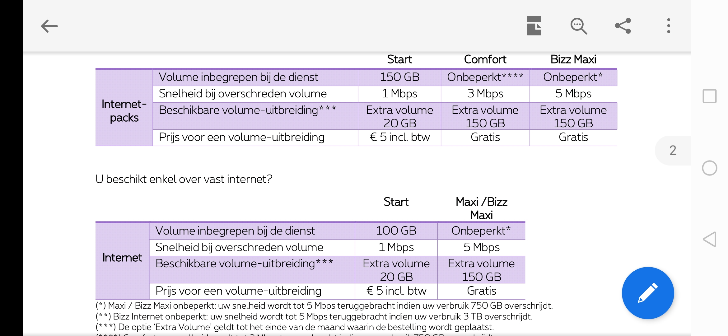 •Unlimited fixed Internet volume: after using 750 GB, your Internet speed will be limited until the end of the following month, unless you activate your free 150 GB of extra data via MyProximus. As of November 1st, this volume will be upgraded to 3TB. More information: proximus.be/internetpolicy