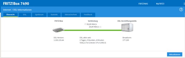 Ik gebruik een Fritzbox 7490 (duitse versie), met Fritz!OS 07.12. De DSL-versie is 1.100.133.44. Ik woon <200m van de telefoonkast.