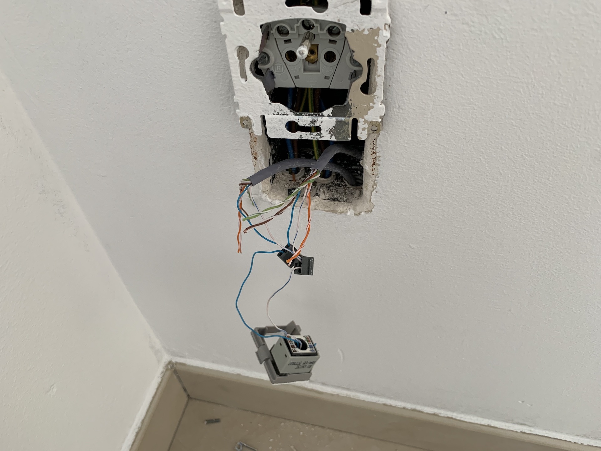 In de slaapkamers en de living zijn er RJ45-aansluitingen in de klassieke Niko-wanddoosjes. Deze 'uiteindes' waren echter nergens te vinden, maar na openschroeven werd duidelijk dat enkel de kabelparen voor telefoon zijn aangesloten. Beneden in de kelder heb ik een Belgacom introdoos gevonden, met eenzelfde blauwe UTP-kabel. Deze is echter nog niet aangesloten in de doos, maar hangt er los naast.