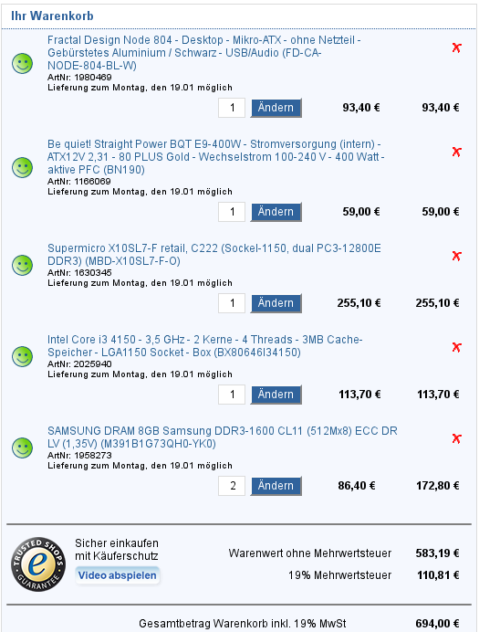 Supermicro X10SLL+-F-O LGA1150 (180 €) + I3-4150 (met AES-NI) (107€) + 16 GB ECC ram (150€) + kast (xx €) + power supply (xx €) = +- 590€