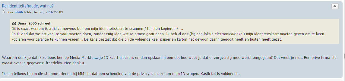 Nog maar eens verkeerd knopje gedrukt. Vergeet die bedankt maar. Wat ik wou zeggen: ikzelf (en met mij vele anderen) liggen wakker van de ID fraude en niet van het taalgebruik. Indien je je geroepen voelt om te reageren op de ID fraude, graag. Voel je je geroepen om te reageren op iemands taalgebruik in 1 of andere winkel, dan is dat zeker geen bijdrage aan dit topic. Want dit topic gaat NIET over taalgebruik.ditCh schreef:Erg respectvol taalgebruik ... shame on you!ub4b schreef:Dima_2005 schreef: Ik zeg telkens tegen die stomme trienen bij MM dat dat een schending van de privacy is als ze om mijn ID vragen. Kasticket is voldoende.