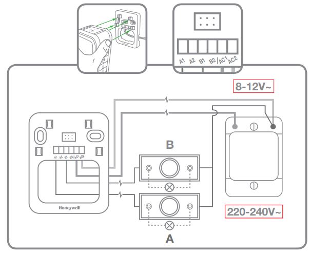 3) A2 van de Honeywell wordt uitsluitend aangesloten als je op batterijen dus DC werkt