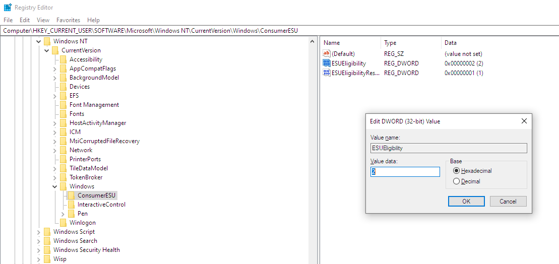 Volgens de registry ben ik althans deze keys, dus wel Eligible voor Consumer ESU: