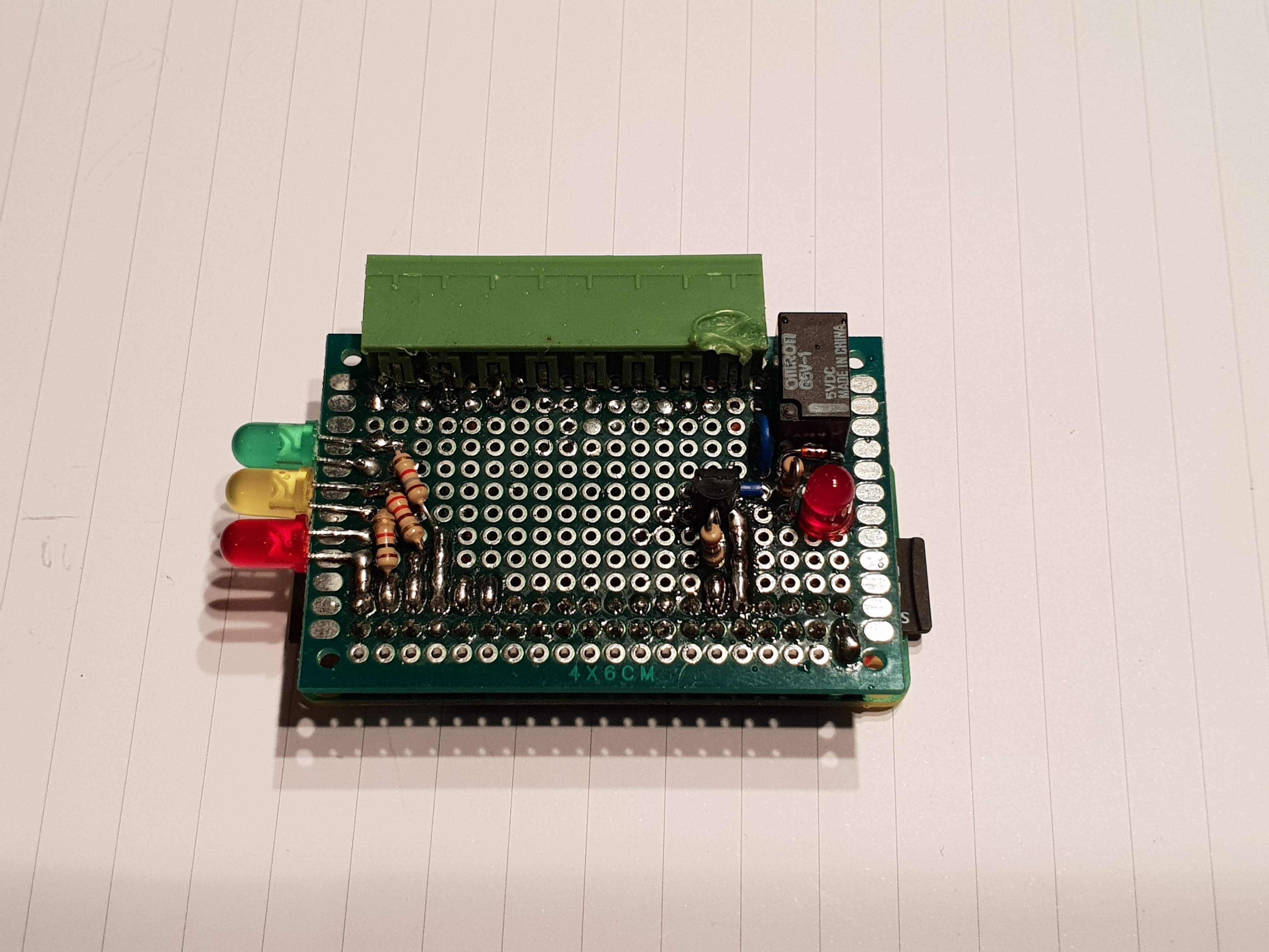 De 3 ledjes aan de zijkant zijn voor statusweergave. Op basis van de frequentie waarop ze knipperen weet ik wat de status is van de netwerkverbinding en de statemachine. Handig bij debuggen, maar ook om te zien of het systeem niet hangt of gecrashed is. Ook een extra ledje bij de relais dat aangaat wanneer het relais aan staat.