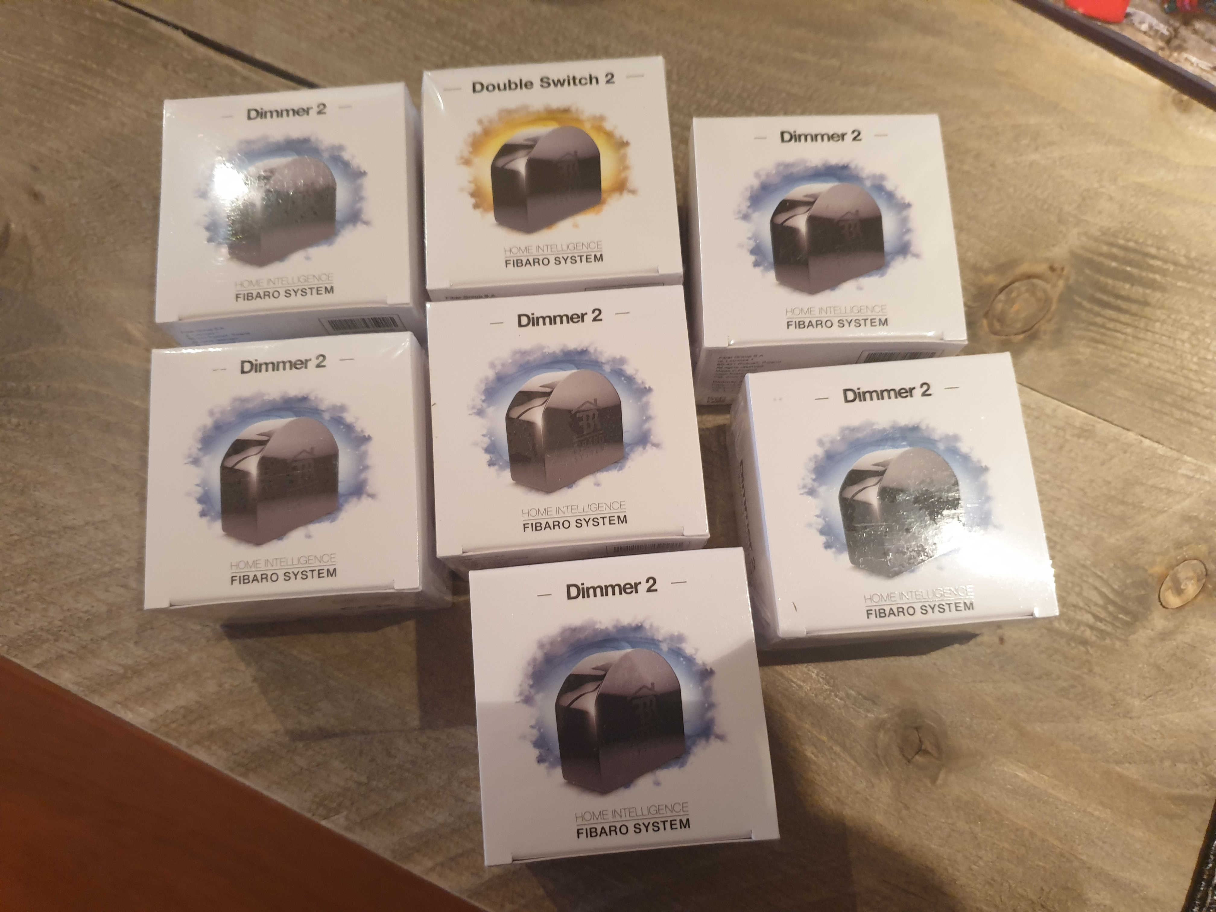 Extra dimmers (en 1 double switch) zijn binnen, samen met de Eutonomy cases voor montage in de meterkast.