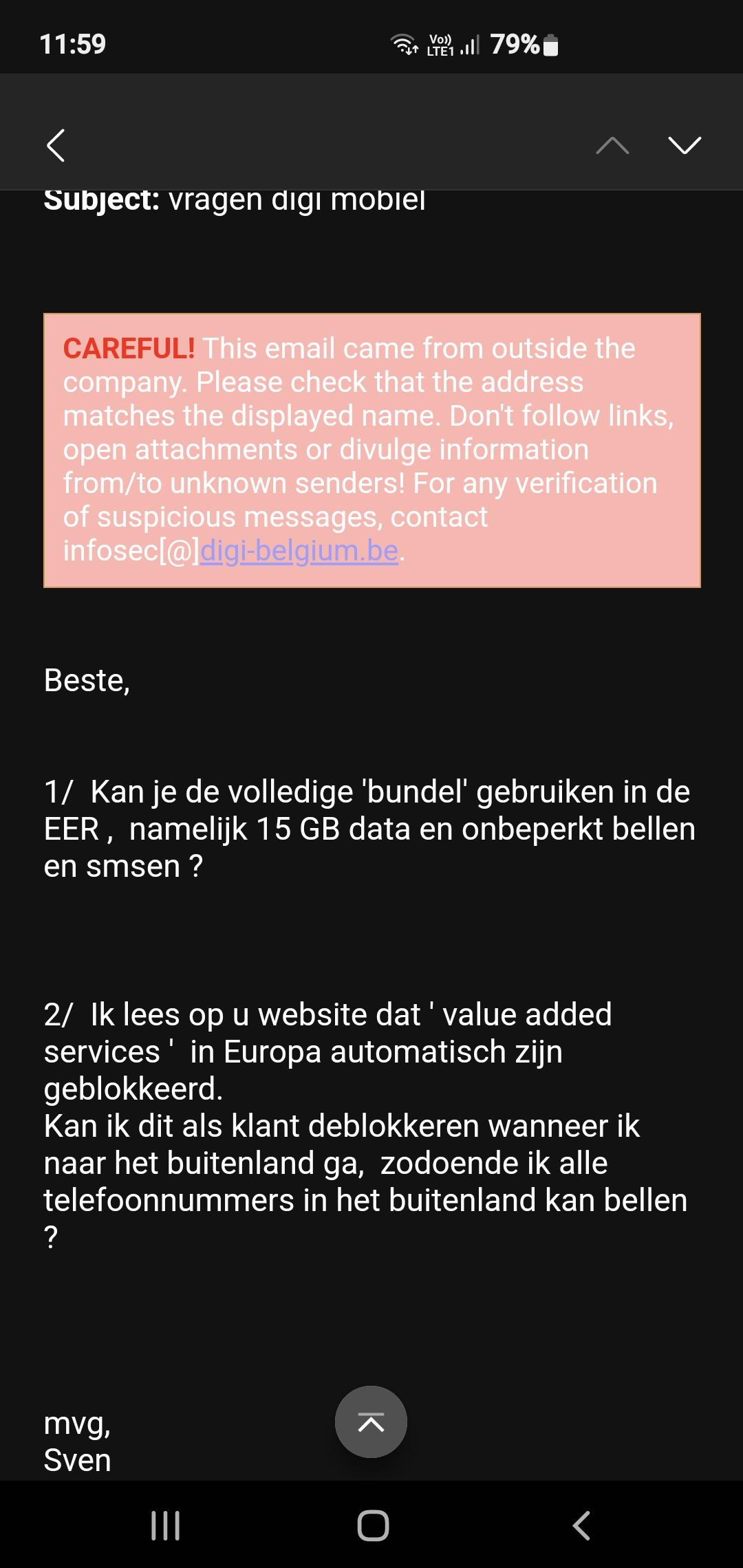 Heb net eens gebeld. Ze konden zien dat ik effectief geregistreerd ben, maar blijkbaar zijn er problemen met hun mailservice. Ik kreeg bij het begin van het gesprek te horen dat het 'drukker dan normaal' zou zijn. Als ik dit bij andere providers hoor, bereid ik me al voor om minstens een half uur aan de lijn te hangen, dus ik hield mijn hart al vast... Nog geen 2 minuten later hing er al een vriendelijke meneer aan de lijn die mij heel snel heeft geholpen. Daar kunnen andere providers nog wat van leren!metoyou schreef: 17 dec 2024, 12:05Strange Entity schreef: 17 dec 2024, 11:46 Gisteren rond 18u mijn gegevens ingevuld om over te stappen naar DIGI. Ik heb nog steeds een pre-paid sim-kaart omdat ik amper bel, amper sms en ik gebruik ook amper mobiel internet. Met 15 euro om de 2 of 3 maanden kwam ik ruimschoots toe. Maar 5 euro per maand voor onbeperkt bellen, sms'en en 15GB mobiel internet is toch wel een heel goede deal. Het probleem is dat ik, net zoals veel anderen blijkbaar, nog geen bevestigingsmail heb ontvangen. Ook niet in mijn spam.