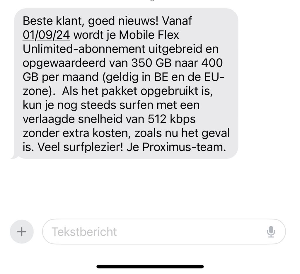 Beste klant, goed nieuws! Vanaf 01/09/24 wordt je Mobile Flex S-abonnement uitgebreid en opgewaardeerd van 12 GB naar 15 GB per maand (geldig in BE en de EU-zone). Je zult dus meer data hebben om naar hartenlust te surfen. Veel surfplezier! Je Proximus-team.