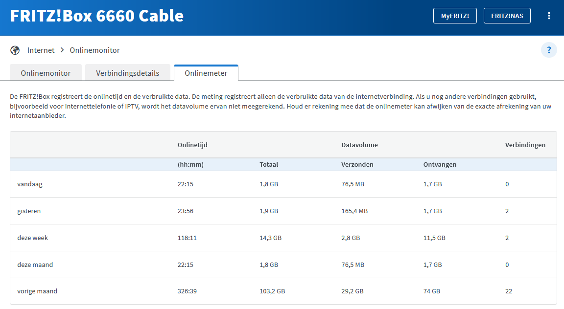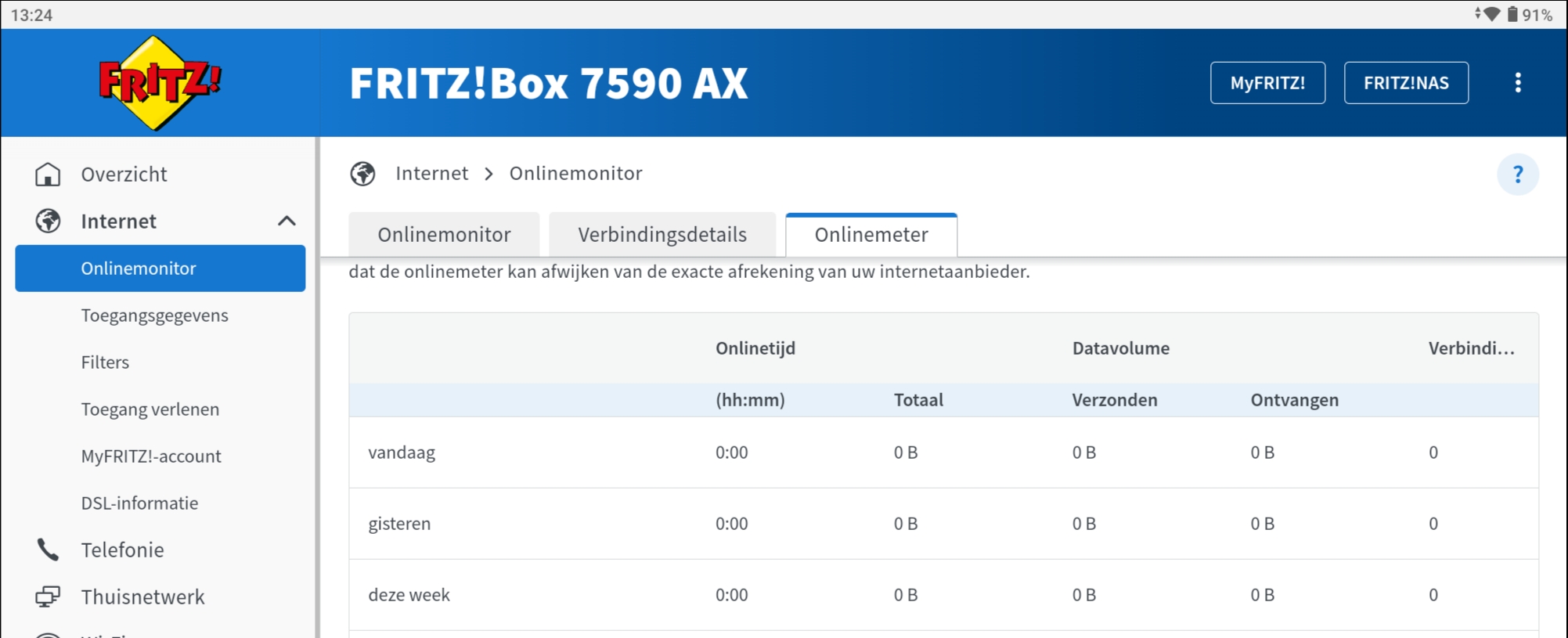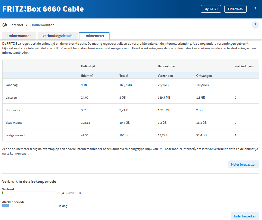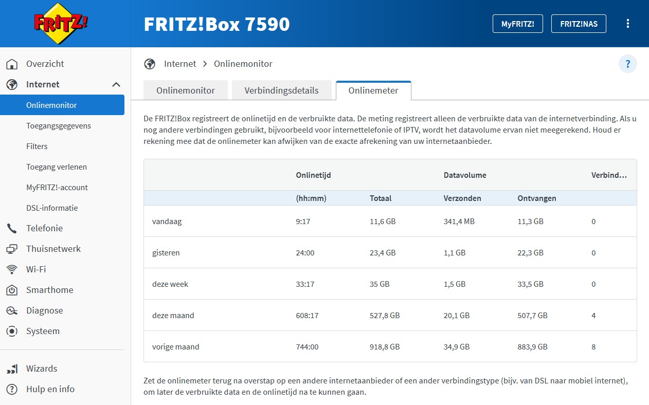 En nog maar een issue met de 7590AX. Onlinemeter is gestopt met registreren. En er is al wat data binnen gekomen, meerdere gigabytes. Deze maand en vorige maand geven wel cijfers weer in alle kolommen.