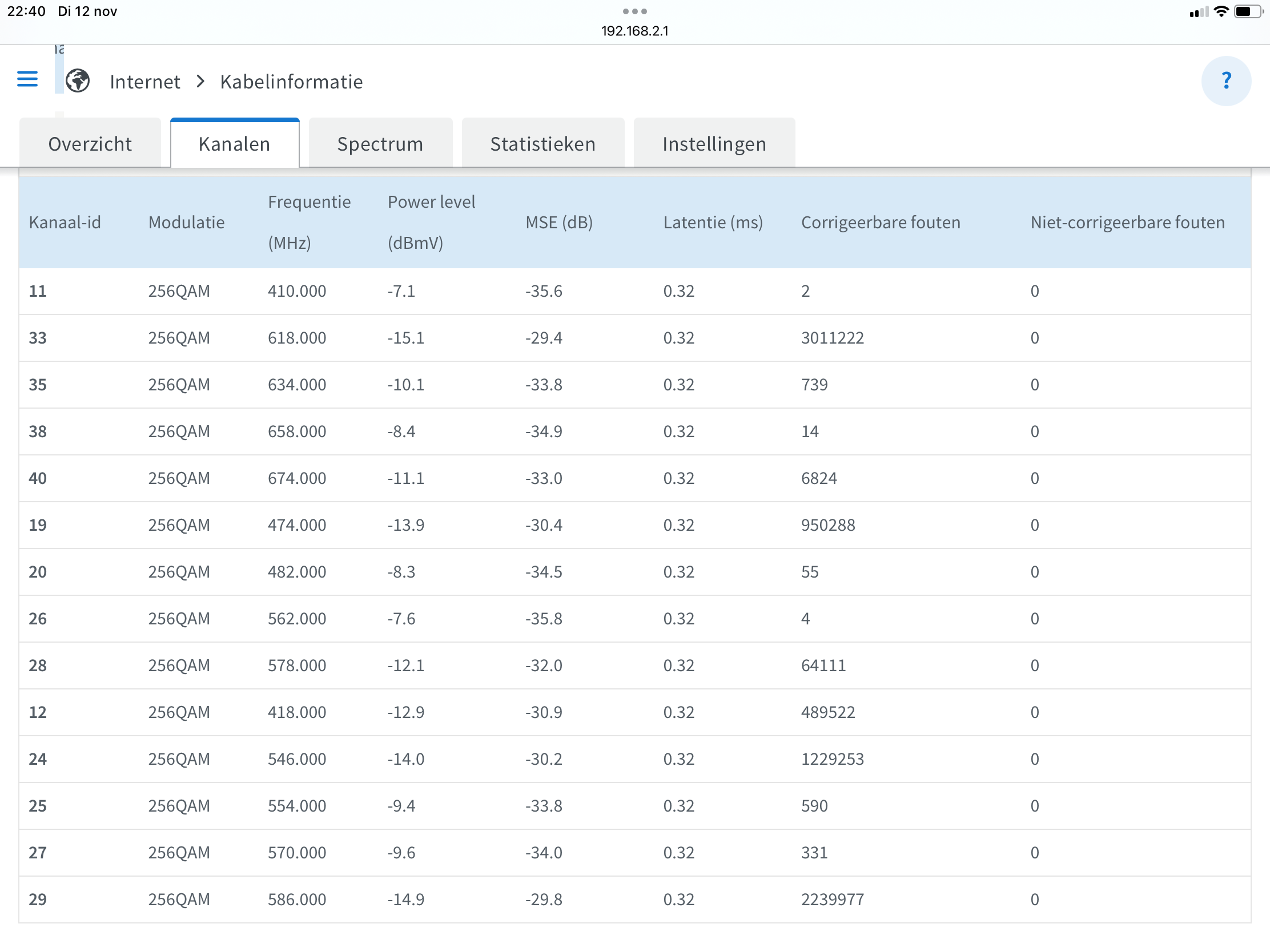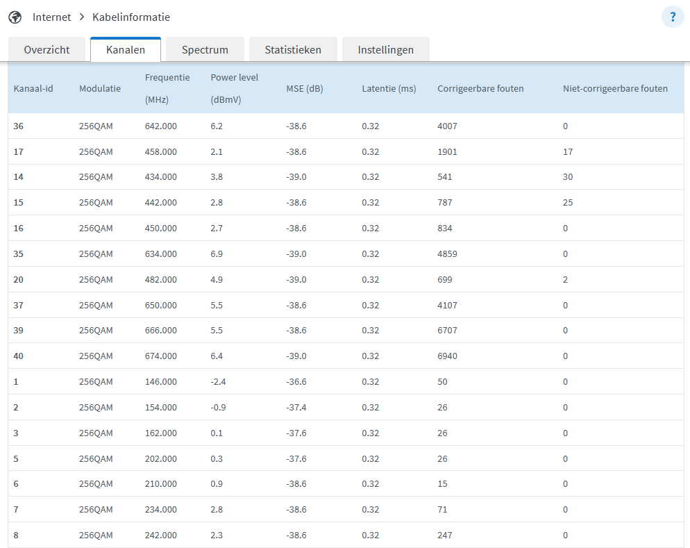 Als ik jouw waarden vergelijk met deze hier (zie screenshot onder), dan valt mij op dat de signaalsterkte (Power level) bij jou een stuk lager ligt (gemiddeld -11 dB) dan bij mij (gemiddeld +3 dB)