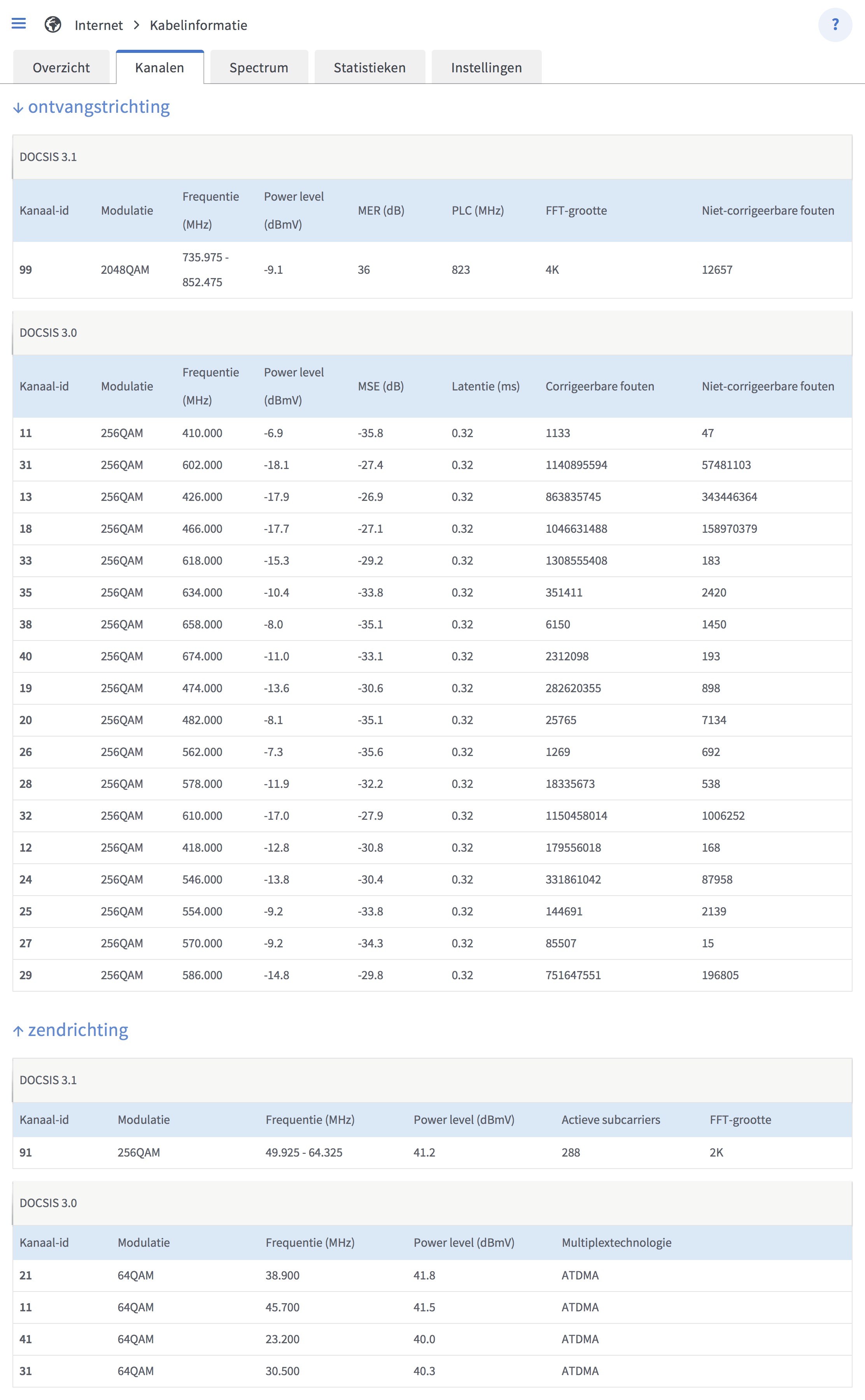De FritzBox gebruikt 28 (van de 40) Docsis 3.0 kanalen + 1 Docsis 3.1 kanaal