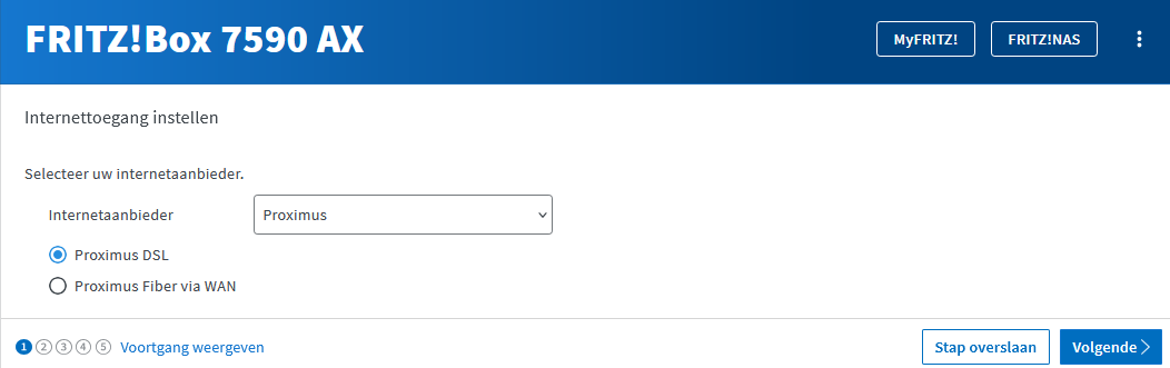 Tijdens het instellen (F!Box 7xxx) moet je de Provider kiezen, vb Proximus. Dan krijg je 2 opties: