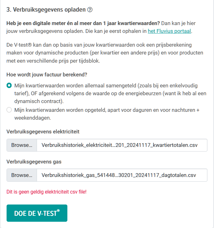 Ik probeerde vandaag een v-test te doen door mijn verbruiksgegevens te uploaden, maar krijg nu steeds de melding dat het geen geldige file is.