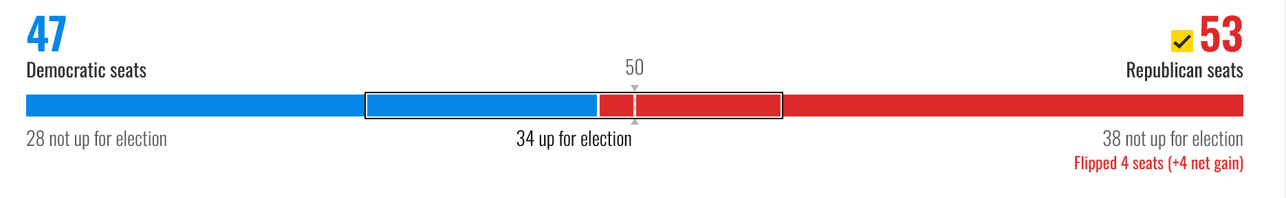 Meer dan twee weken na de Amerikaanse verkiezingen ligt de machtsverdeling in de Senaat nu definitief vast: de Republikeinen beschikken er over 53 zetels, de Democraten over de resterende 47. De laatste zetel is voor de Republikein David McCormick, die een spannende strijd leverde met zittend senator voor Pennsylvania Bob Casey, een Democraat. Die laatste heeft donderdag zijn nederlaag toegegeven.