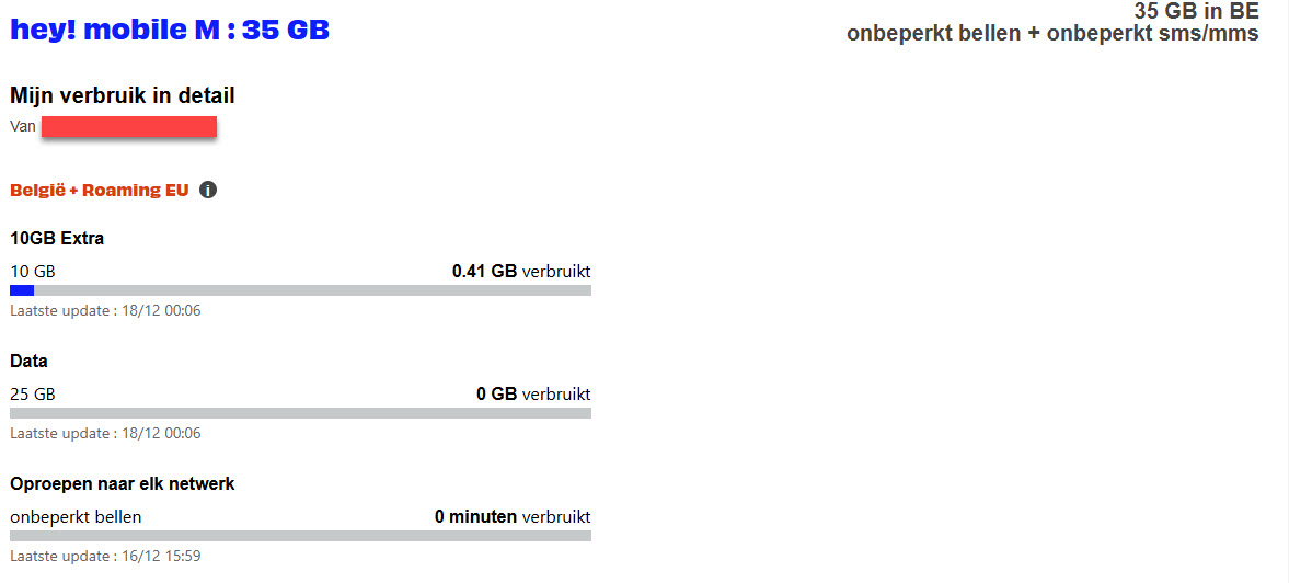 Geen paniek. Hey staat er om bekend om alles eigenlijk fout op hun site te zetten. Op de Franstalige site staat het wel juist, en in de app heb ik wel degelijk een metertje 25GB BE+EU.michaelbelgium schreef: 17 dec 2024, 09:03 Dus 5€ + 0.01€/MB buiten BE + bellen buiten BE ook extra.. of alleen de data