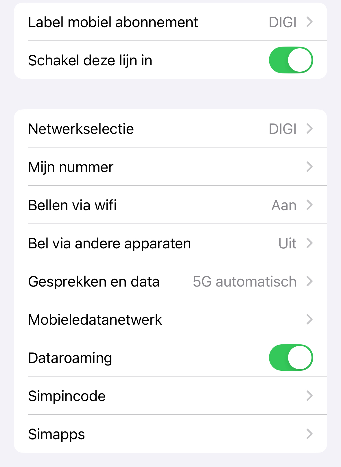 Ik heb de simkaart net geactiveerd, maar geen VoLTE of VoWIFI. Nochtans een Samsung S23, als er een lijst is verwacht ik dat die er zeker op staat. Ik weet ook niet of ik op het netwerk van Digi of Proximus zit, er zou blijkbaar wel op een 5-tal km van bij mij een zendmast van Digi staan.