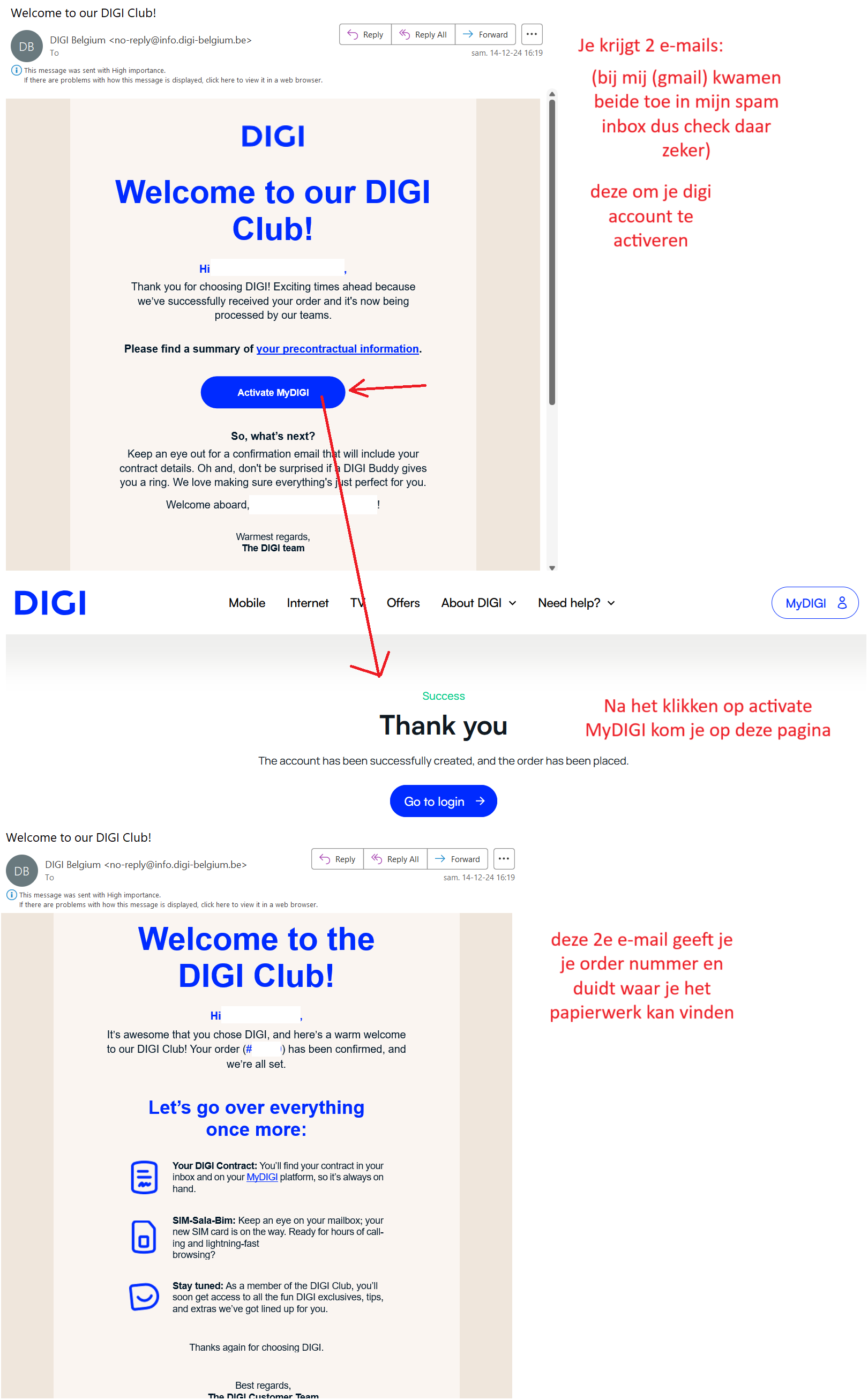 Bij mij zaten de 2 mails van DIGI in mijn SPAM folder. Gelukkig wijzen ze zelf op de spambox tijdens de registratie.