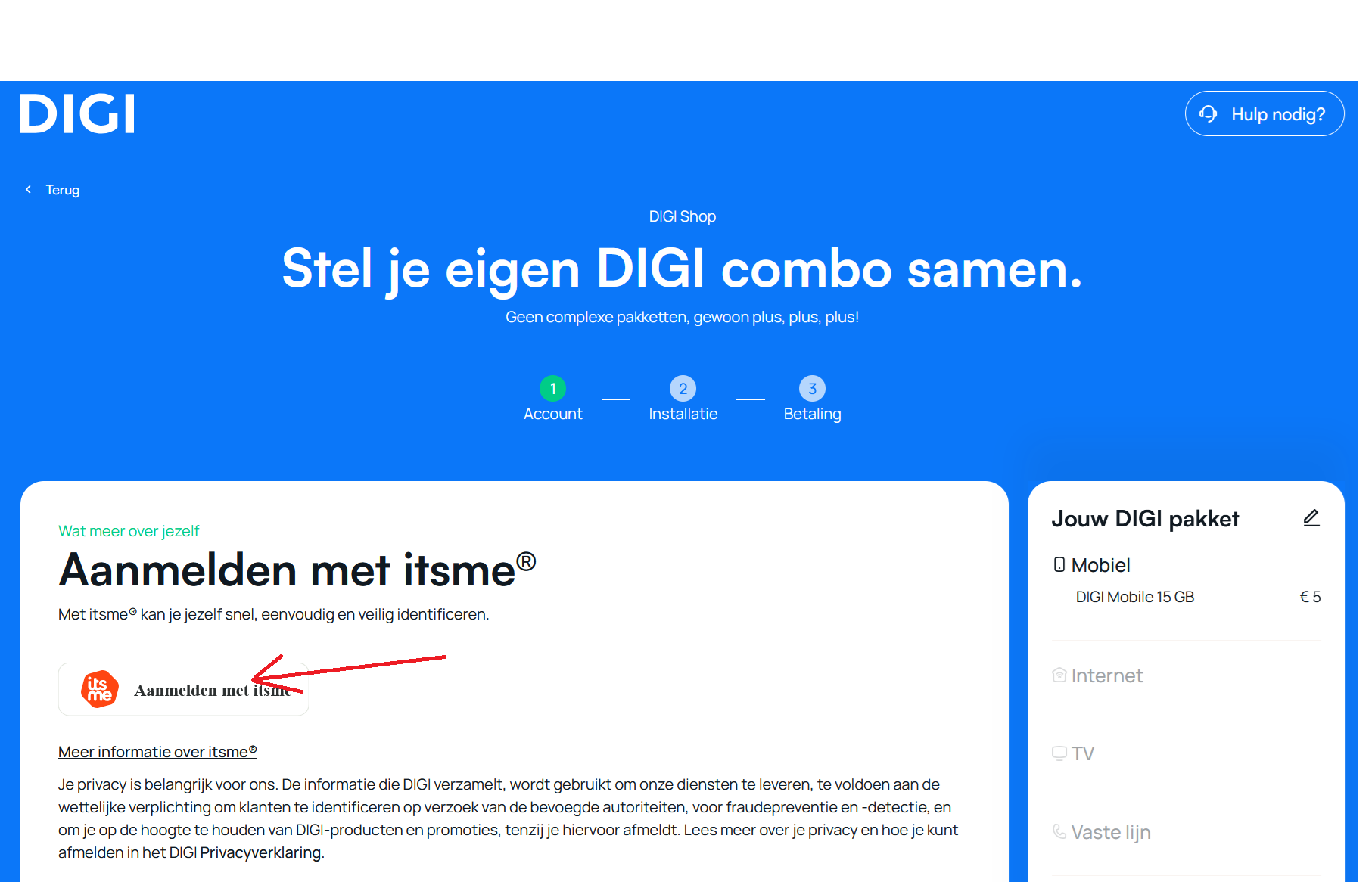 3. Ik moest me aanmelden met itsme. Op die manier kan digi verifiëren of ik wel degelijk ben wie ik zeg dat ik ben ;-). Momenteel lijkt dit de enige manier te zijn om online aan te melden. Itsme is wijd verspreid, velen gebruiken het al voor home banking, voor taxonweb, enzovoort. Let op: je gebruikt uiteraard het GSM-nummer dat gekoppeld is aan jouw itsme voor deze stap