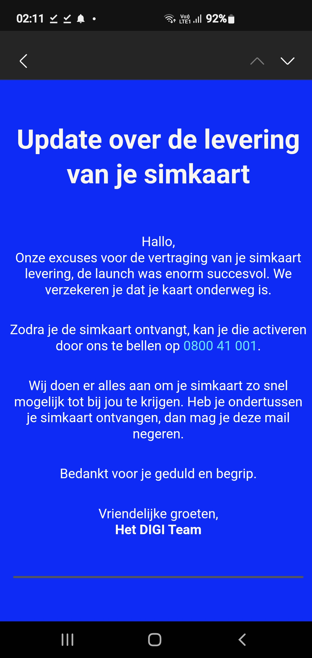 Update: na 4 werkdagen zie ik in "my digi" dat er een mobiel nummer bij mijn product staat, in plaats van "coming soon". Dit is niet mijn eigen nummer maar een 0451-nummer van digi. Mijn eigen nummer zal er pas komen eens de nummeroverdracht compleet is. Nog steeds in blijde verwachting van de SIM-kaart]