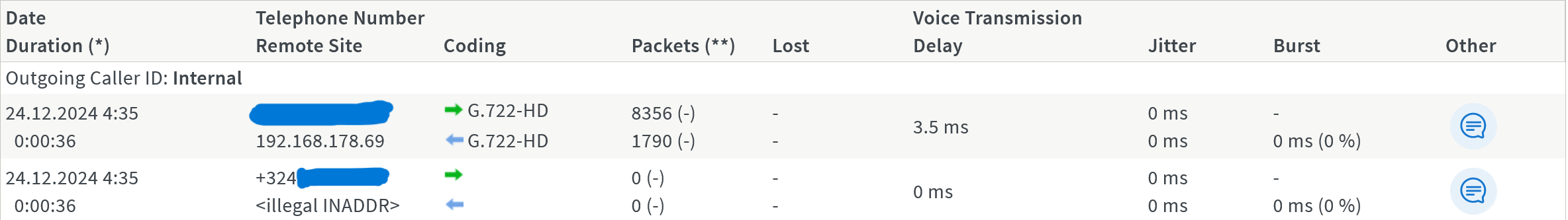 Ik zie ook wel degelijk G.722-HD maar enkel van mijn IP-telefoon tot fritzbox1. Van fritzbox1 naar fritzbox2 en omgekeerd zie ik geen verkeer.