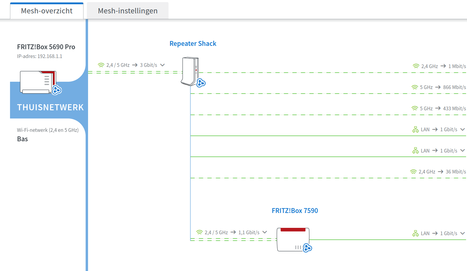 Hier een 7590AX. Verder verspreid in huis 3 repeaters 1200AX. Een aantal toestellen (mr handsfree speakers, pelletkachel, homewizard stroomteller en wifi van de Huawei omvormer) draait op 2,4ghz, de rest op 5ghz. Onlangs viel op dat een speaker verbinding maakte met de FB om die kort nadien te verbreken en opnieuw verbinding te maken. Ik kreeg veel last van hickups tijdens het afspelen van muziek. Ik zag tot mijn verbazing dat de belasting op 2,4ghz ruim 80% was. Wat ook opviel: alle netwerk apparatuur op 2,4 ghz was niet met de FB verbonden maar verliep langs 1 van de repeaters.