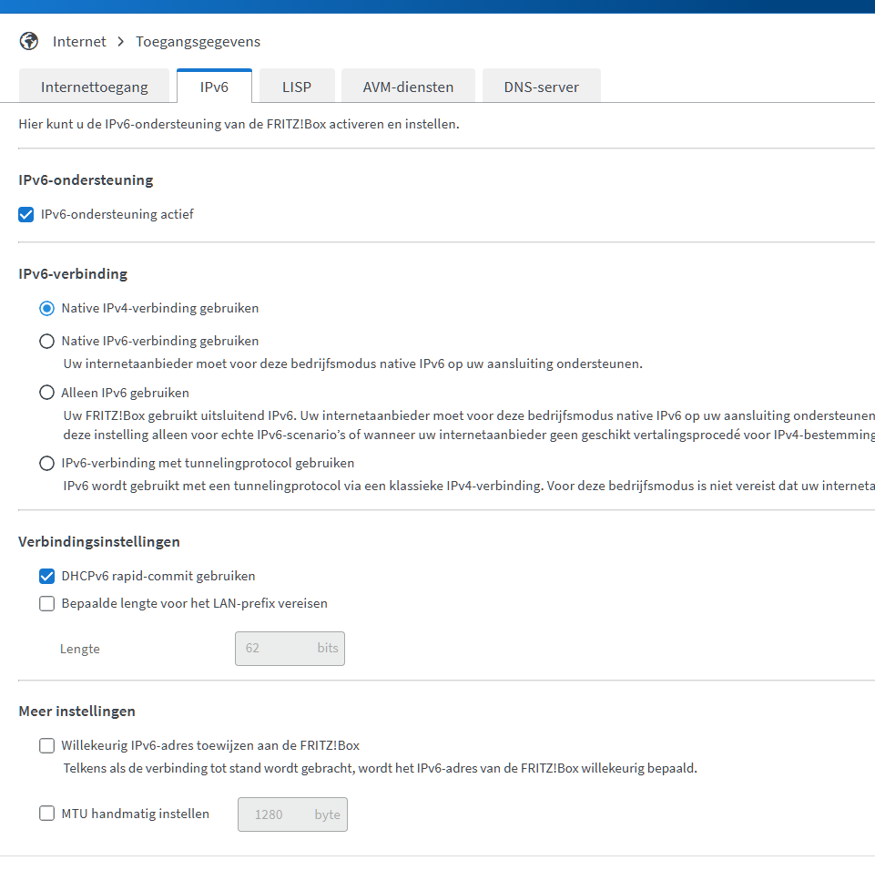 kom nog even hierop terug: dus zoals ik zei, wanneer ik Proximus kies uit de lijst met aanbieders dan is de uploadsnelheid abnormaal laag voor fiber 500/500 en enkel wanneer ik kies voor DSL of glasvezelmodem - Andere internet aanbieder en vul daar een zelfgekozen naam in en zet verderop de VLAN op 20 dan verkrijg ik wel normale uploadsnelheden voor mijn profiel en werkt de tv ook (v5c decoder) maar vrees ik dat die na een kleine week zijn internetverbinding weer gaat verliezen en ik dan zoals vorige keer opnieuw moet kiezen voor internet aanbieder Proximus (en dus weer met trage upload kamp). Zou het kunnen dat de reden dat de tv box na X tijd geen internetverbinding meer heeft, komt door volgende instelling in de Fritzbox: Bij Netwerkinstellingen - Thuisnetwerk - ipv4 instellingen staat 10 dagen ingevuld bij geldigheid ipv4 adressen. Stond standaard zo. Is het misschien beter om dit te verhogen naar 100 of nog hoger?