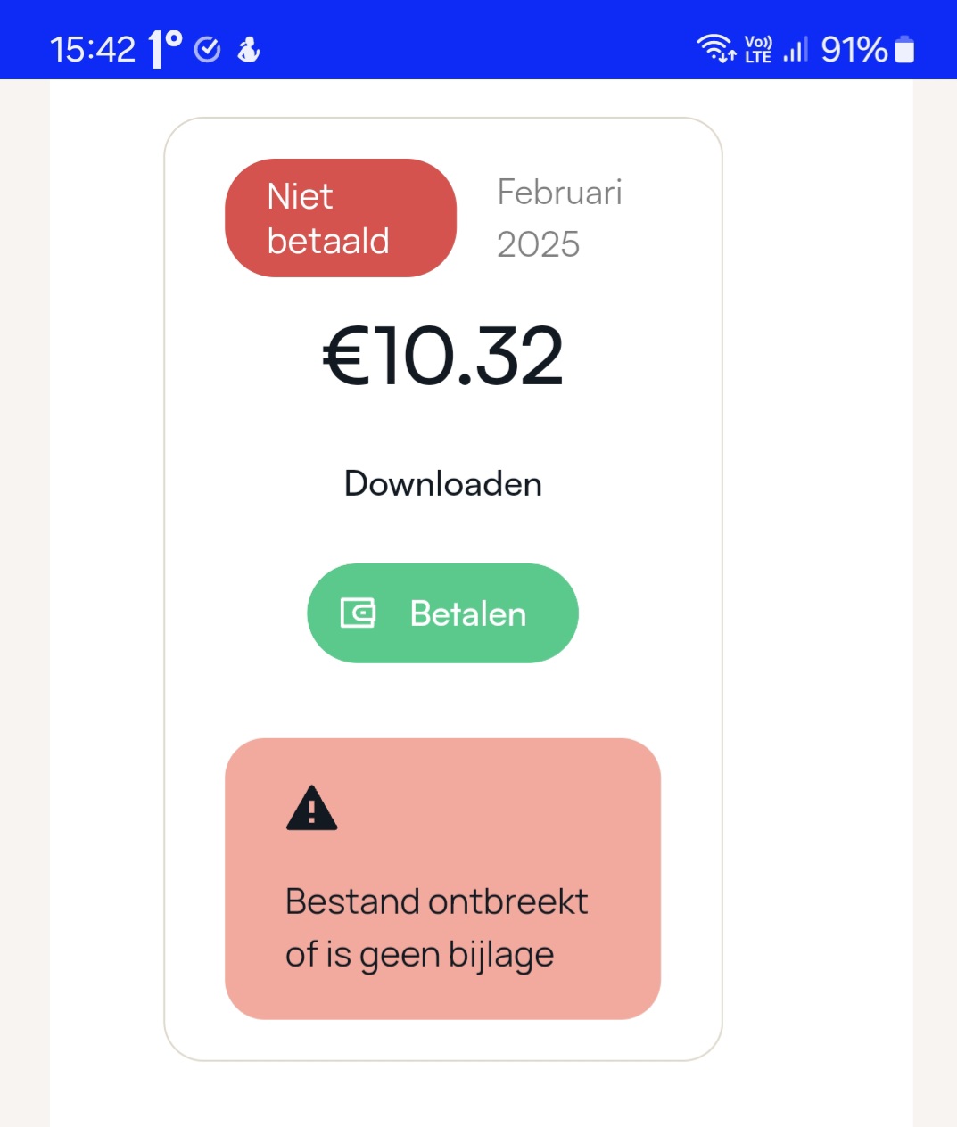 Ik zie in my digi dat er een factuur is, maar heb nog geen mail ontvangen en als ik de factuur wil downloaden krijg ik de foutmelding dat het bestand ontbreekt of dat er geen bijlage is ?