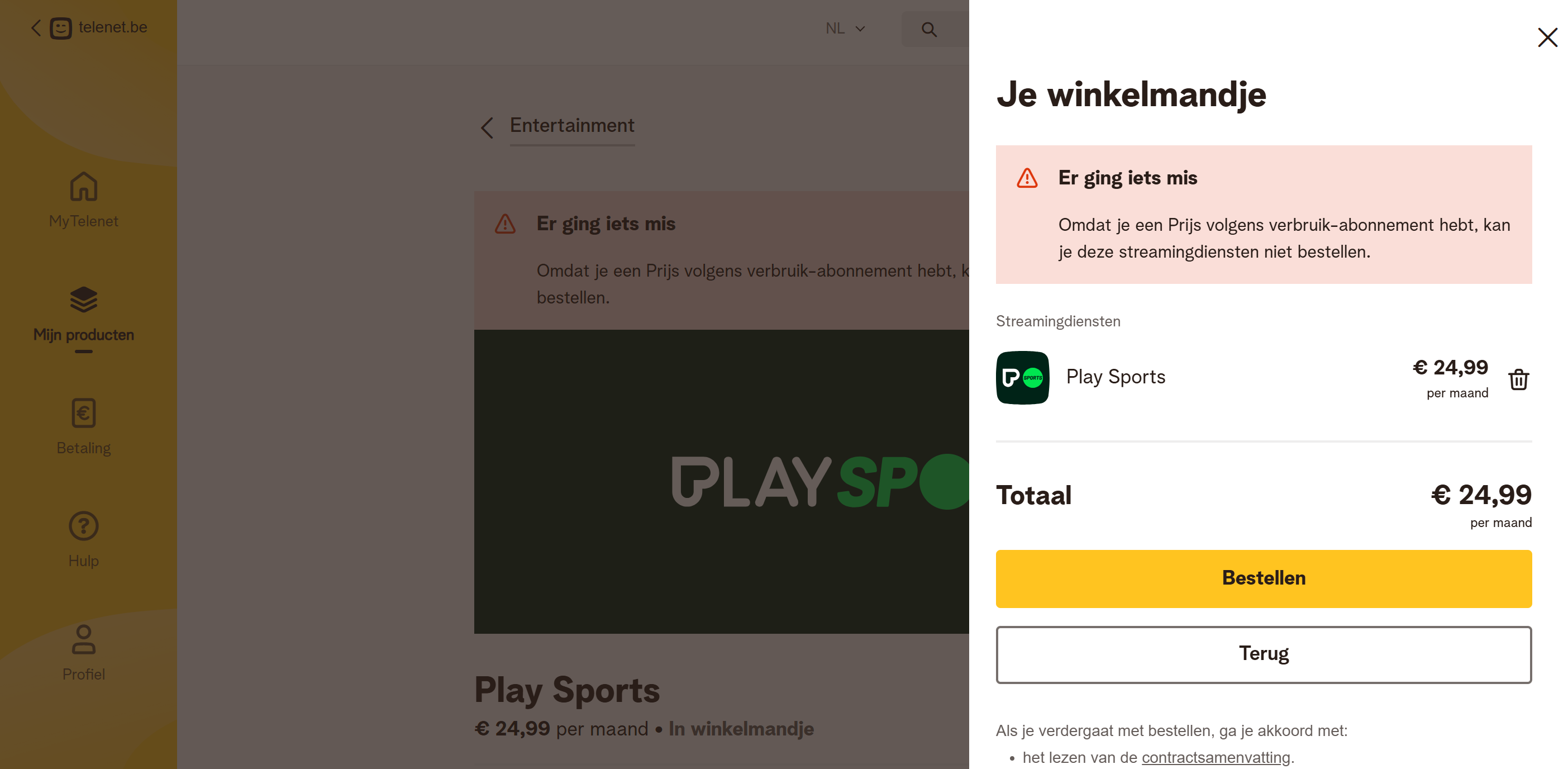 Situatie: Ik heb een Telenet account met 2 "Prijs volgens verbruik" nummers. Vroeger zag ik nooit de optie om op Play Sports te abonneren (enkel Netflix enzovoort). Nu zie ik wél de Play Sports optie, maar krijg ik de onderstaande melding.