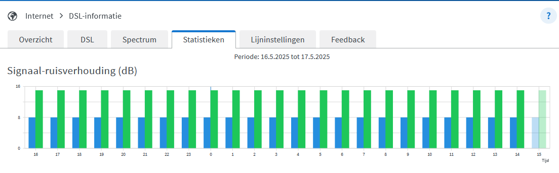 • In het Menu Internet > DSL-informatie > Statistieken, kan je de lijnkwaliteit zien van de laatste 24 uur. Hier zou je duidelijk kunnen zien als je lijn sedert de interventie gisteravond plots verlechterd is (SNR naar beneden)