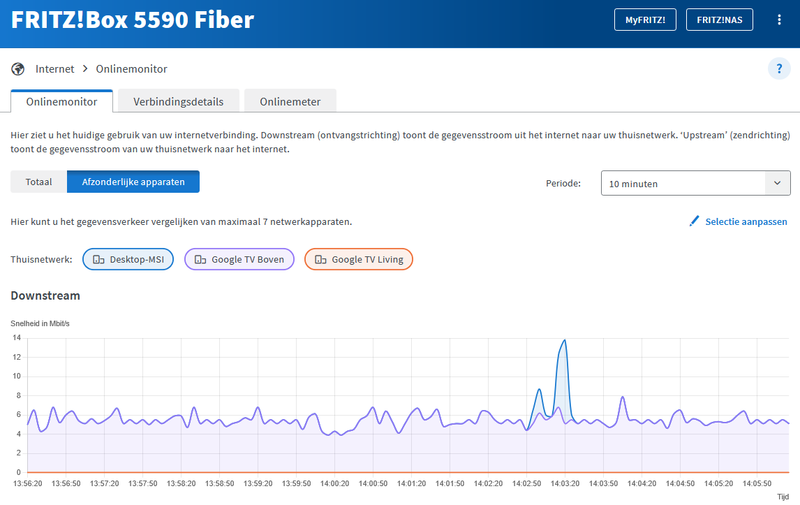 Ik keek gisteren van 22:00 tot 23:55 uur TV via VRT Max streaming op de TV.philippe_d schreef: 25 mei 2025, 14:33 streaming via VRT Max: schommelt rond de 5.5 Mbps, maar je moet ook de upload meetellen (continu 200 kbps), neem dus ca 6 Mbps = 21.6 Gb per uur of 2.7 GB