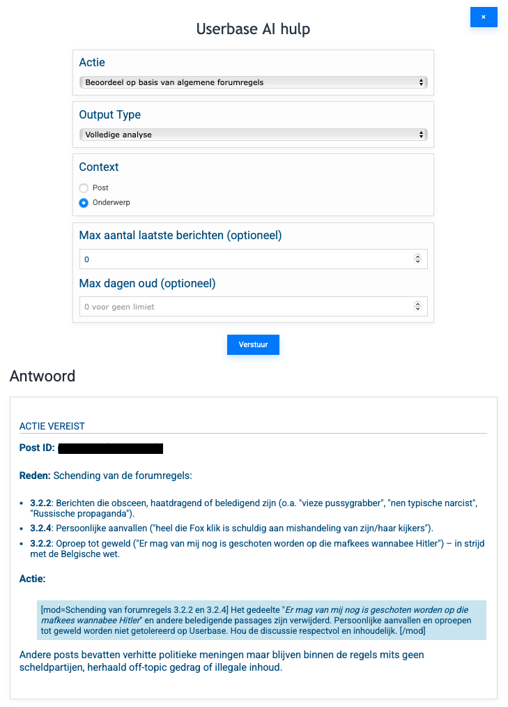 Onze ervaring met huidige LLMs is dat ze niet perfect zijn, maar zeker goed genoeg om deze taak te ondersteunen! De eindbeslissing om een reactie of maatregel te plaatsen (al dan niet ondersteund door een duidelijke analyse van de tool met referenties) blijft altijd bij de moderatoren, maar zij kunnen nu eenvoudiger en sneller handelen dankzij deze ondersteuning.