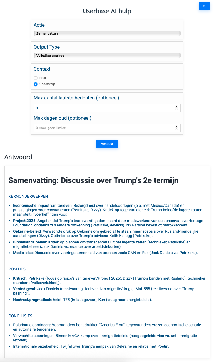 Wij geven de volledige posts met alle gebruikersnamen door aan de LLM. De response zal ook elke keer verschillen (vat maar eens een aantal keer iets samen en je zal dat merken). Het LLM is dus niet perfect, dat weten we en daar houden we rekening mee, maar het is zeker goed genoeg.Dizzy schreef: 09 jun 2025, 19:11 Ik heb de voorbeelden eens snel overlopen en het ziet er redelijk OK uit maar toch vind ik het vreemd dat sommige nicks van posters gebruikt worden en anderen niet. Dat geeft de indruk dat enkel hun bijdrage belangrijk genoeg is, wat niet het geval is, en geeft mij de indruk dat de samenvatting nogal sterk afhangt van welke posts men gebruikte. Ik vrees daarom dat de "resultaten" meer discussie gaan opleveren dan ophelderen. In de samenvatting van mijn eigen posts in de voorbeelden vind ik de samenvatting weinig genuanceerd in die mate dat ik soms mijn eigen mening er niet altijd in herken.