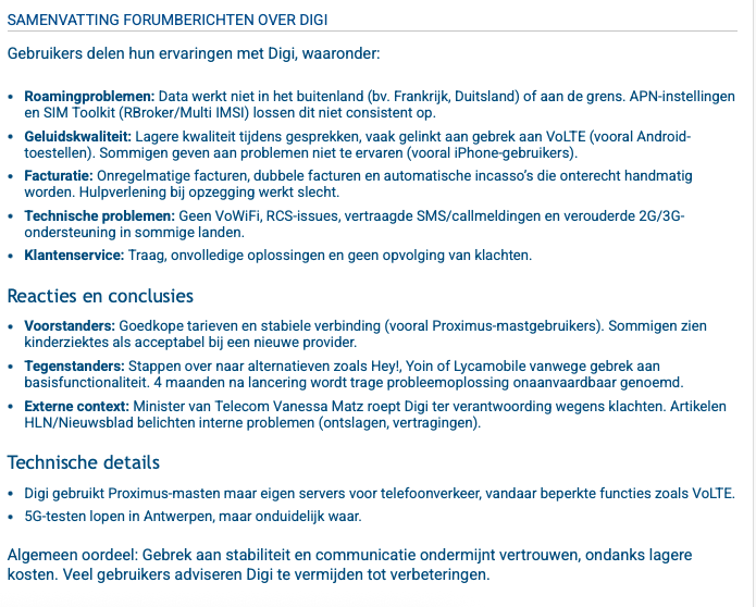 Rechtstreeks vragen aan een LLM kan, meer geeft voor onze specifieke markt en de actualiteit meestal niet het gewenste antwoord. Een LLM heeft bv. ook geen ervaringen met een nieuw product of de dienstverlening van een provider.