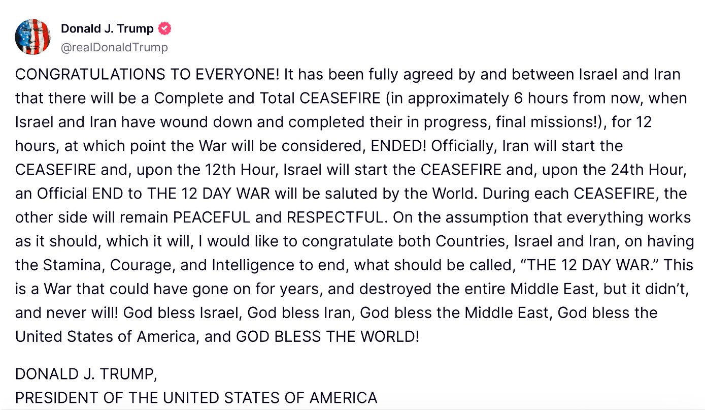 Edit: En volgens Trump kwamen zowel Israel als Iran naar hem voor dit staakt-het-vuren en komt het initiatief dus niet van Iran ;-)