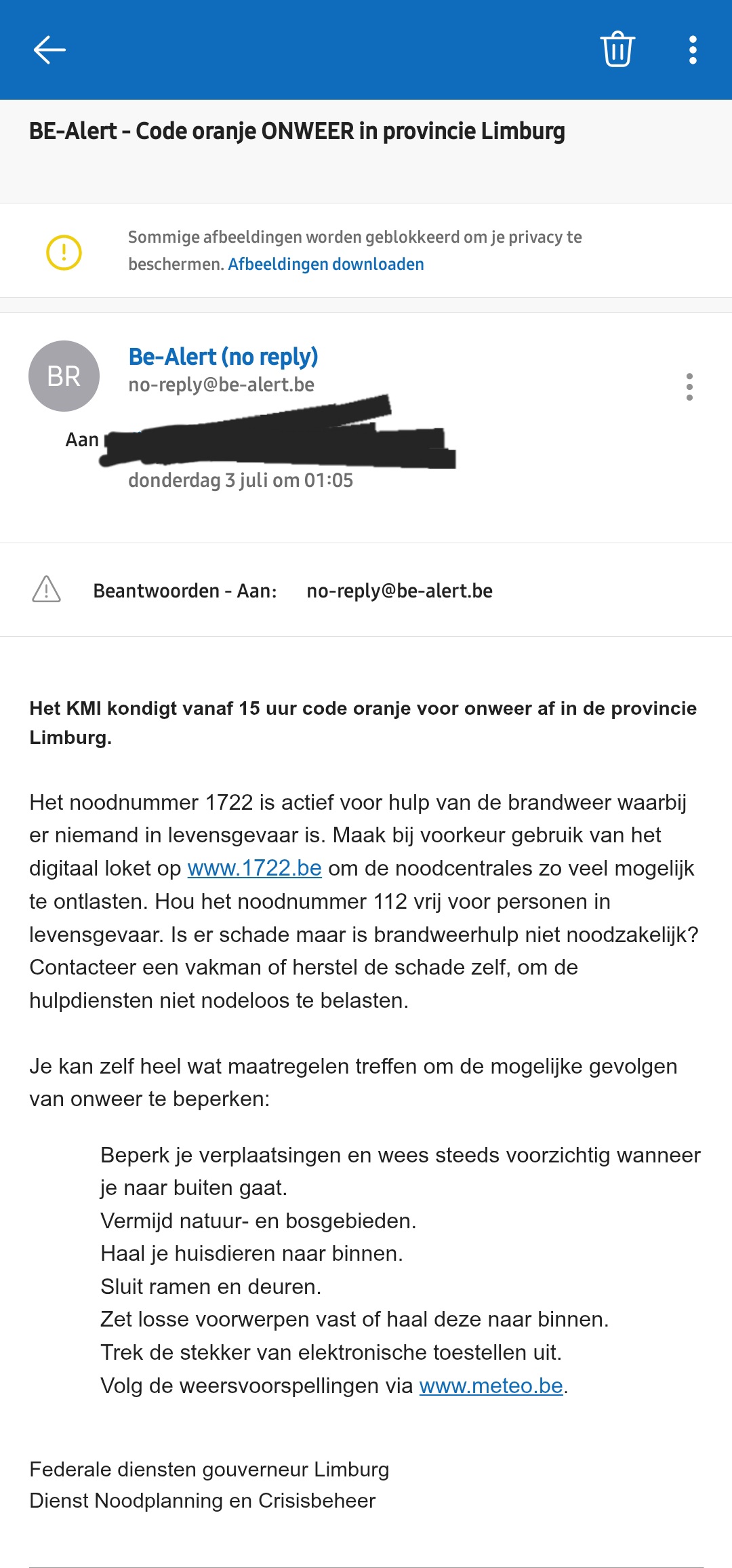 Zeker dat dit niet was voor de "dodelijke hitte"?nerph schreef: 4 maanden geleden Dat is vreemd, ik kreeg die mail (maar dan provincie Oost-Vlaanderen) op 30 juni.