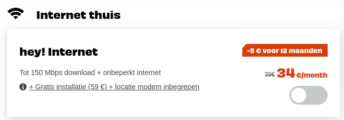34 euro en na 12 maanden 39 euro, wie is zo dom om daar in te trappen, terwijl het op de gewone https://www.heytelecom.be/nl/internet-thuis site 34 euro for life is: