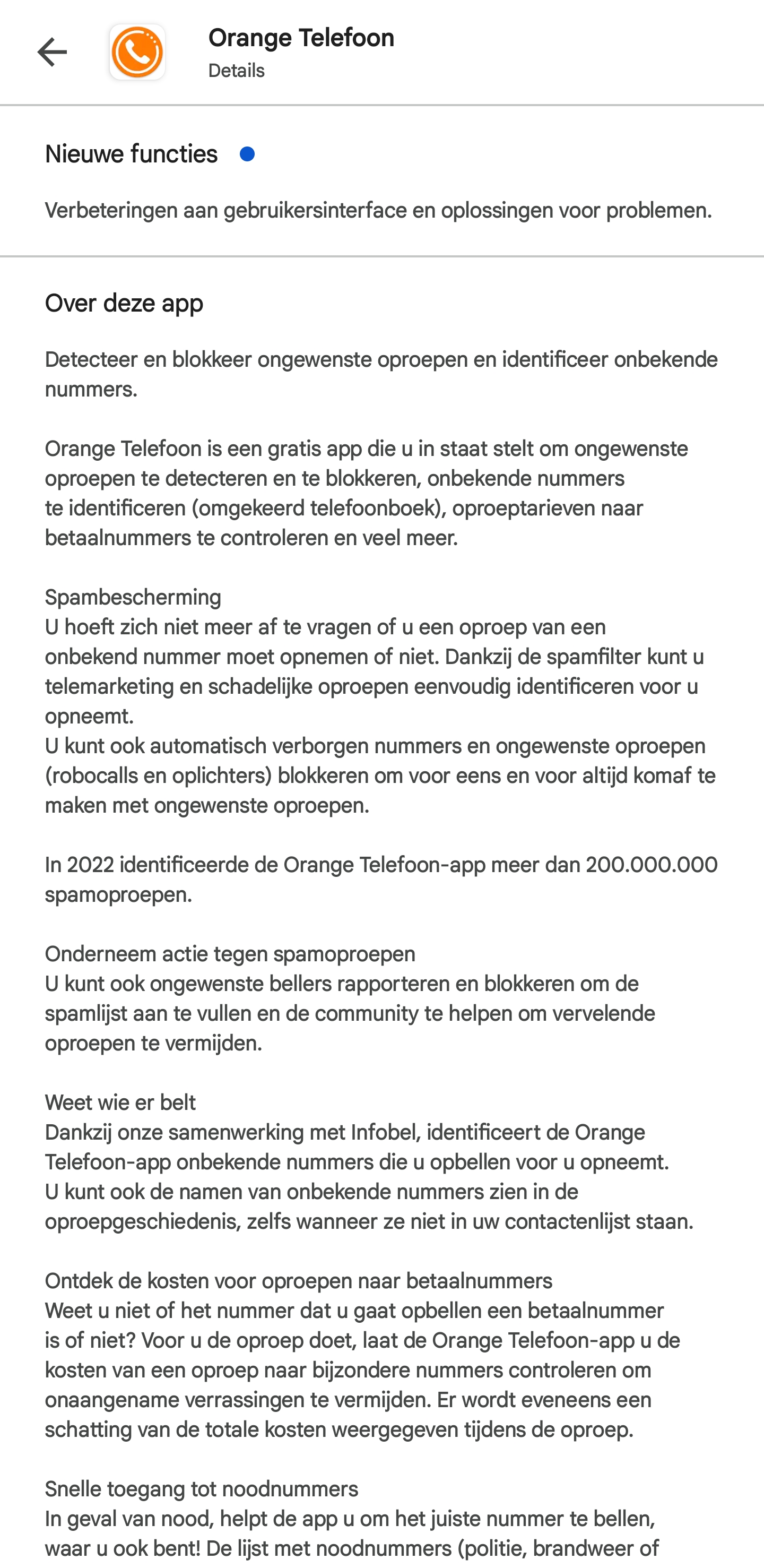 Data technicus schreef: 3 maanden geleden Je kunt ook de orange telefoon app instaleren zoals ik gedaan heb en dan instellen dat buitenlandse nummers automatisch geblokkeerd worden. Dan heb je geen last van ongewenste telefoons uit het buitenland.