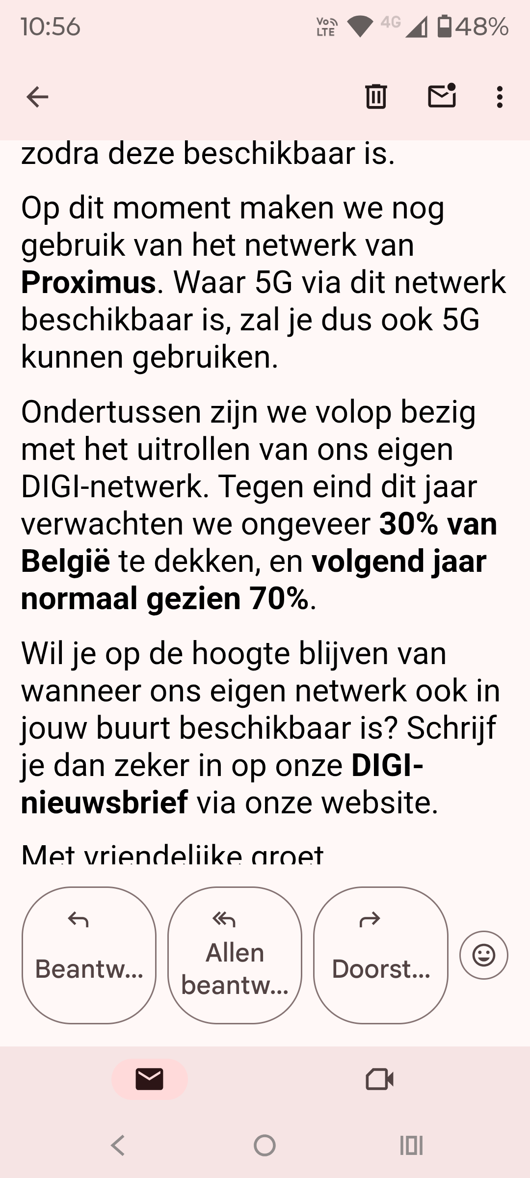 Er is steeds gezegd dat Digi het 4G netwerk van Proximus huurt tot wanneer ze zelf een volwaardig netwerk kunnen aanbieden.Pluk schreef: 12 jul 2025, 11:02 Heeft er al iemand 5g bij digi telecom. In een mail van digi zeggen ze ,waar Proximus 5g aanbied zouden wij dat ook hebben. Al op veel plaatsen geweest waar ik zeker ben dat Proximus 5g aanbied, maar zie het niet op mijn gsm . Blijft op 4g.