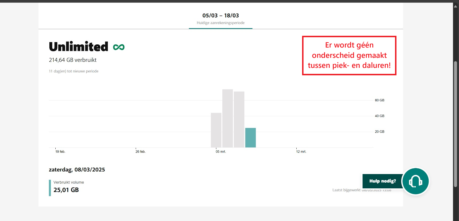 Ze maken in de praktijk inderdaad helemaal geen onderscheid en tellen alles gewoon bij elkaar op. Waardoor je zeer snel op smallband (na 3TB verbruik in piek- én daluren) belandt. Echt een no-go dan... Heb het uitvoerig getest, en tijdens daluren bleef de teller maar omhoog gaan.