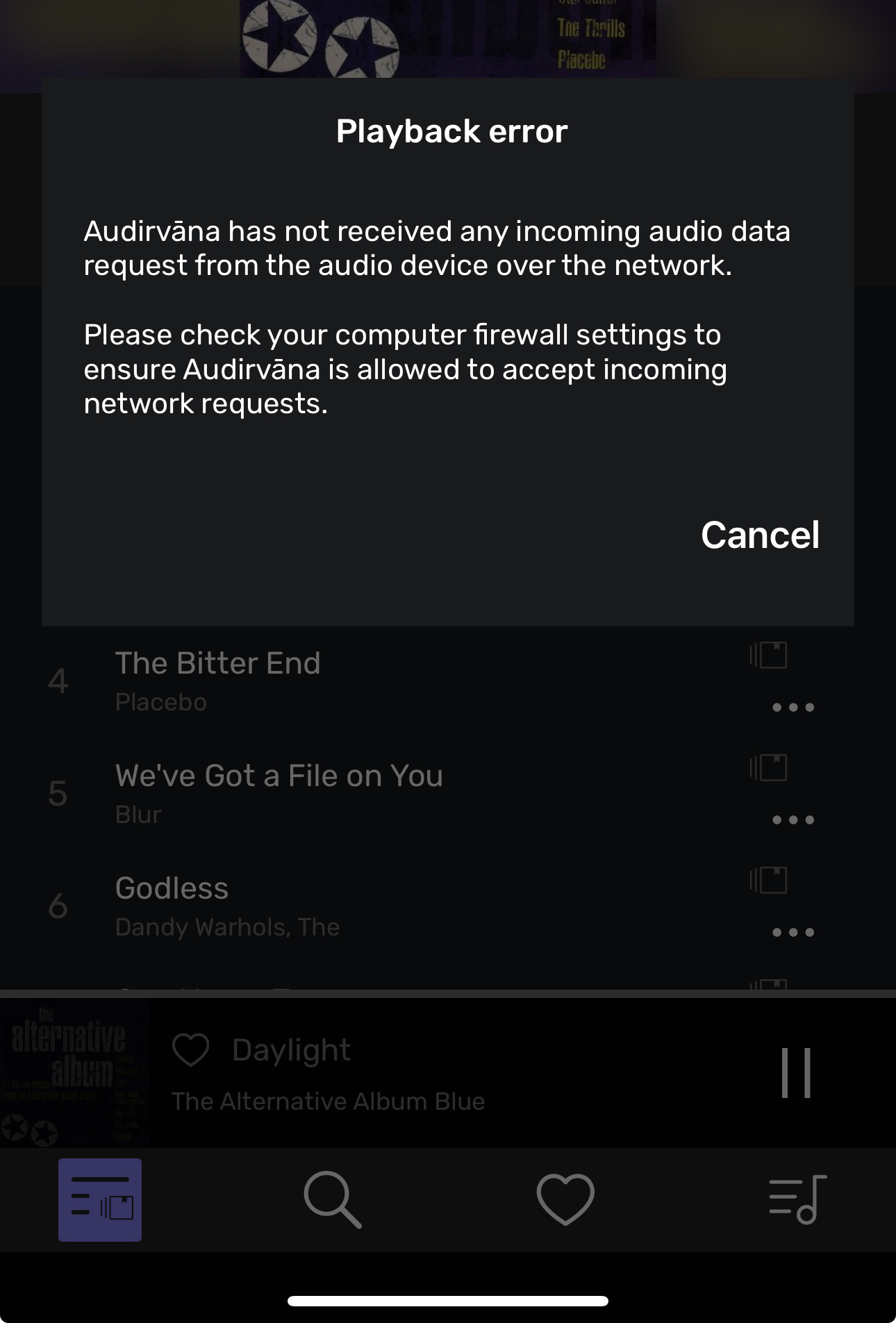 Ondanks deze firewall melding lukt het wel om nummers af te spelen op de windows desktop pc maar de bedoeling is om de muziek te "streamen" naar een upnp apparaat, mijn marantz av8802. En daar loopt het mis. Start ik een nummer vanop de ios app (ik kan mijn muziekbestanden zien in de app) dan komt er steeds de volgende playback fout, ook weer gerelateerd aan windows firewall