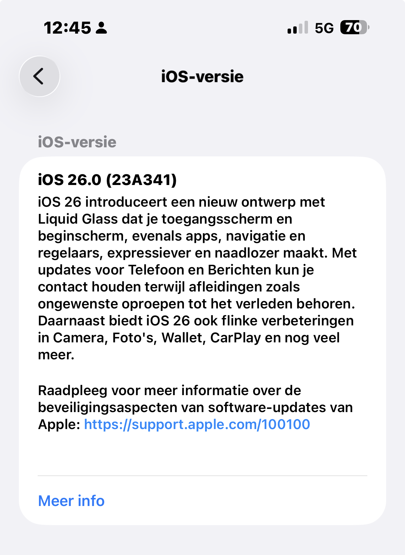 Zonet ios 26 geïnstalleerd op de 15PM en daar zou iets nieuws bij zijn een glass look maar bij mij ziet alles er nog veel uit zoals ervoor. Als ik bij instellingen zoek op glas of glass vindt hij niets