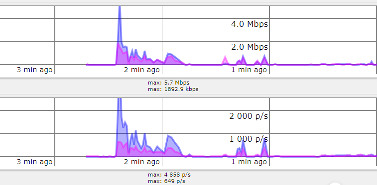 Ter info het piekje wat de docker applicatie even kort trekt, is in de orde van 6500 packets/s via de RB1100AH . En hup, enkele minuten nadien faalt Tidal op Roon weer op de andere router die samen de modem deelt, ondanks de reboot.