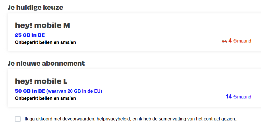 sterker, als ik mijn product wil upgraden krijg ik zelfs geen van de kortingen te zien, dan is het 14 euro voor L en 50gb aan data... dat is dan weer een slechte deal.