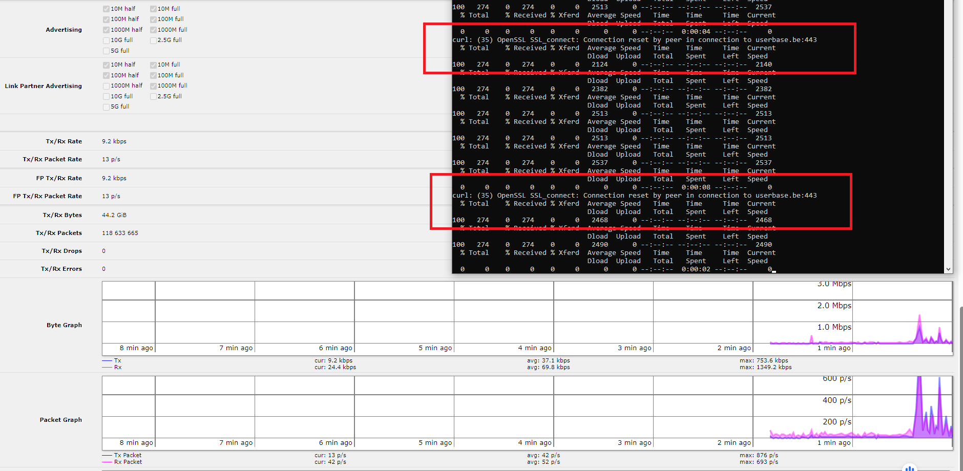Ik zie de curl test soms eens vertragen naar 1s, en gisteren zelfs éénmalig tot 11s (dit was naar userbase), maar ik zie geen SSL resets meer! Meestal na 4s vloog de curl er al uit. Nu na ruim 10s nog niet.