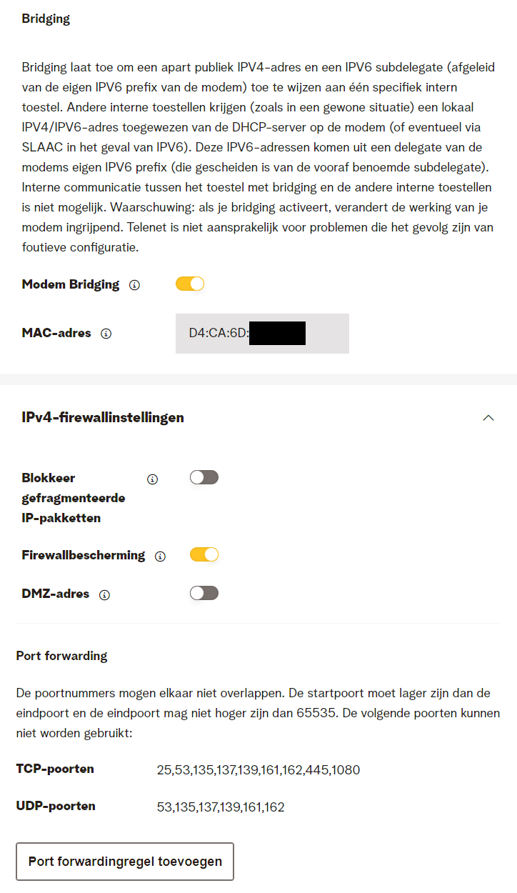 Maar het lijkt er dus op dat de aangesloten Mikrotik in bridging mode (die dus een public IPv4 krijgt) onderhevig is aan firewalling als die optie aan staat in mijn telenet, dus bridging mode op de modem is geen pure layer2.