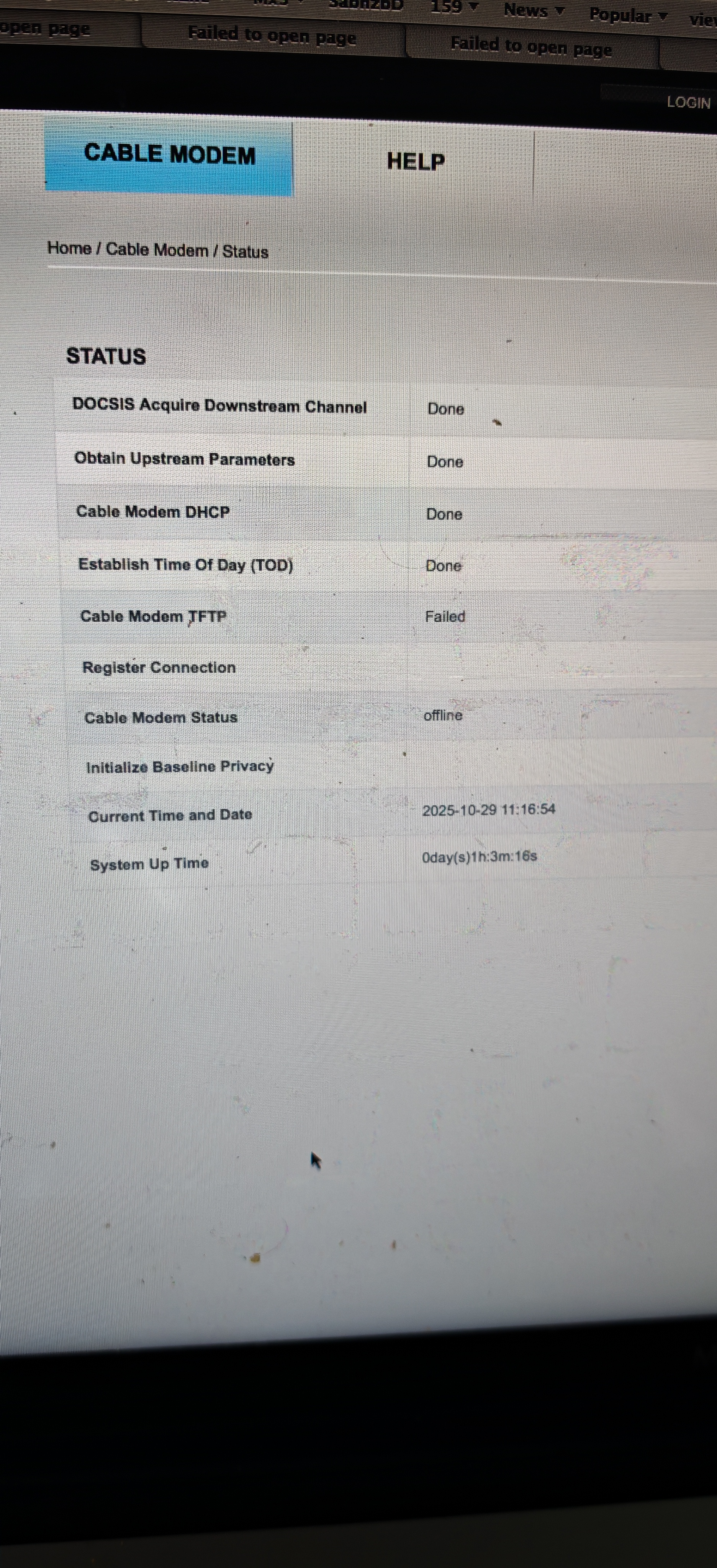 Modem meld aan op de cmts, modem vraagt dan via tftp config file op. Er is geen config file voor jouw mac adres. Hierdoor kan je modem niet registreren op de cmts. Lijkt achterliggend issue bij telenet (beheren de cmts en bijhorende tftp).