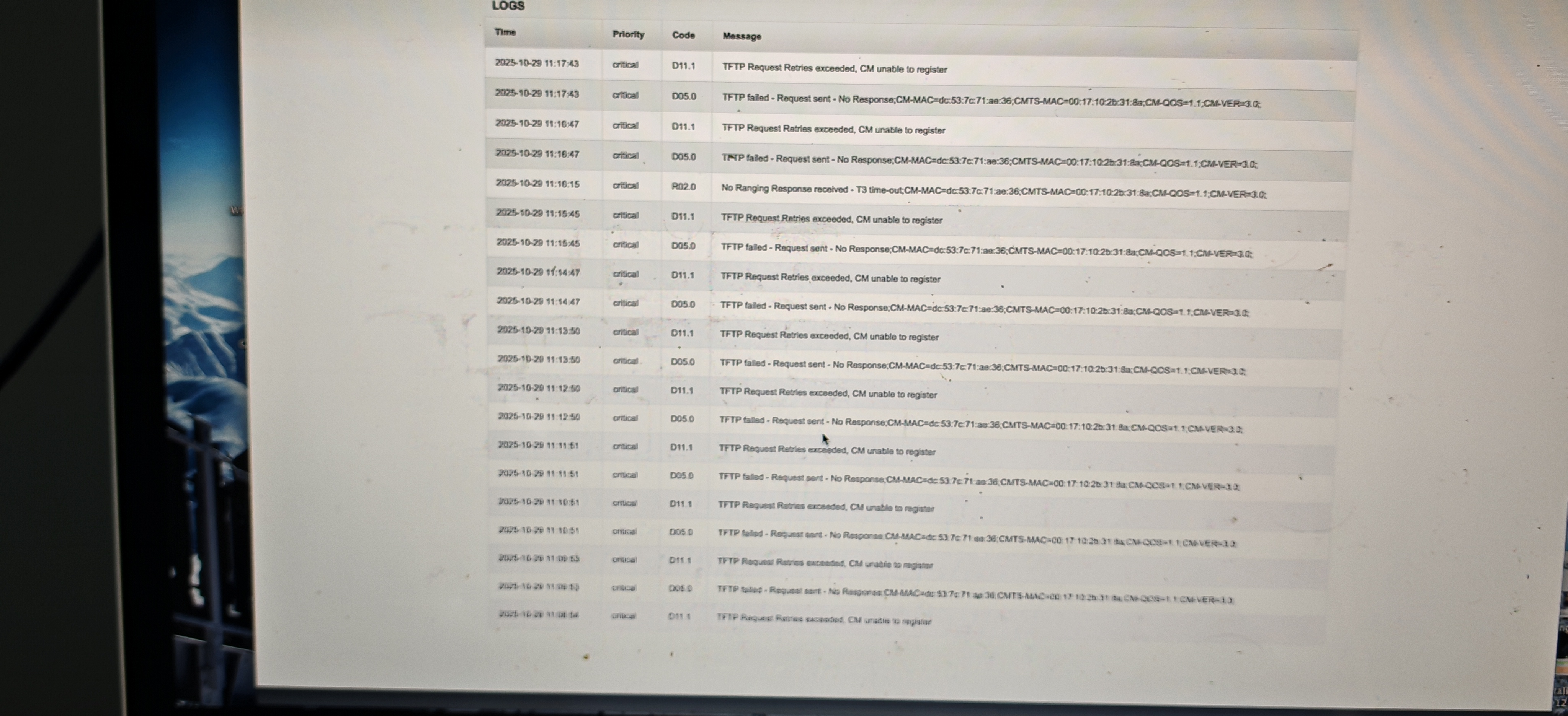 Modem meld aan op de cmts, modem vraagt dan via tftp config file op. Er is geen config file voor jouw mac adres. Hierdoor kan je modem niet registreren op de cmts. Lijkt achterliggend issue bij telenet (beheren de cmts en bijhorende tftp).