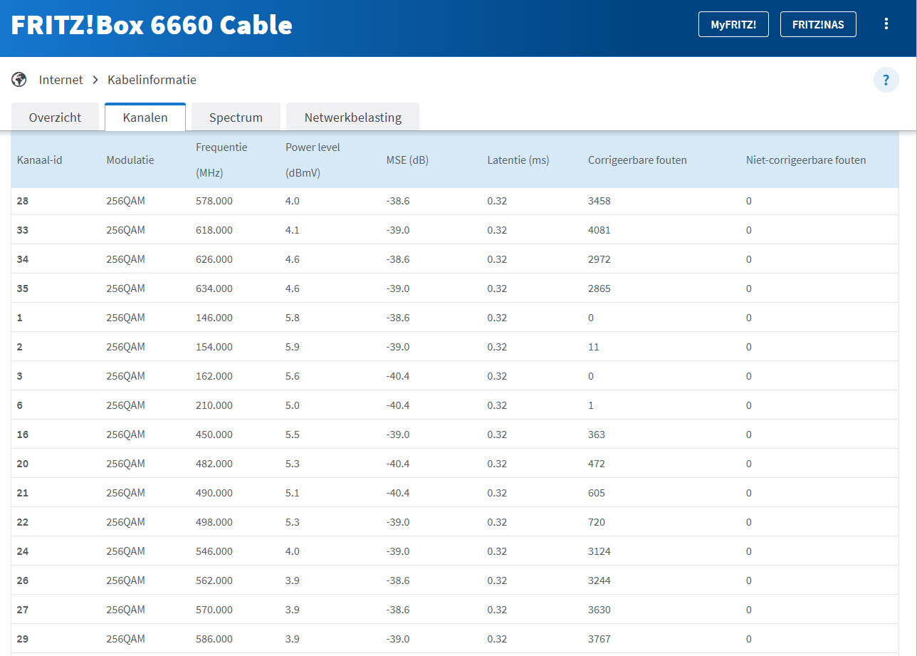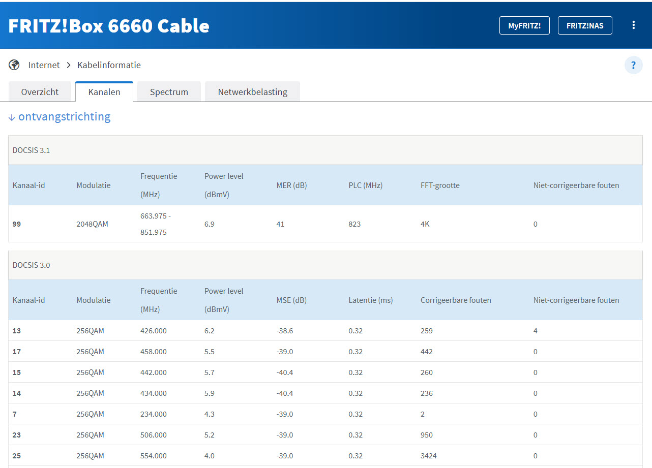 Daar had ik eigenlijk een vraag over. Ik heb sinds een maand plots problemen (?). Ik vermoed door ingress door een buur. De dB is inderdaad goed, maar bij "Niet-corrigeerbare fouten" zie ik plotselling echt veel fouten, dit had ik vroeger op dit adres via mijn Fritzbox totaal niet. Ik vraag mij dus echt af wat ik het beste kan doen. Het SWAT-team uit hun kot krijgen, kan wel eeuwen duren?philippe_d schreef: 2 maanden geleden Spectrum laat ook zien dat de kwaliteit van jouw coax uitstekend is: gelijkmatig op alle frequenties een SNR van ca +5dB![]()