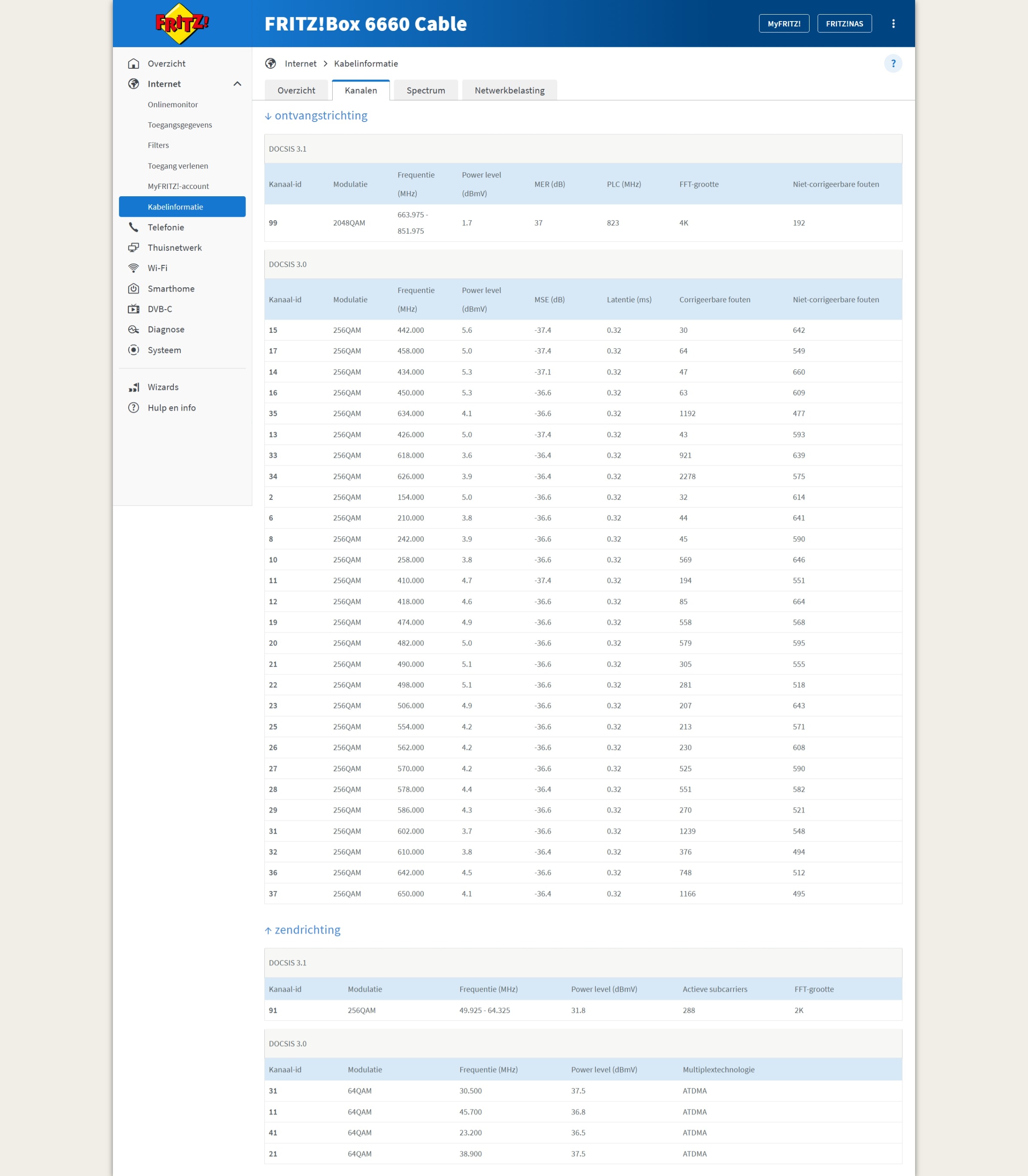 - Intnernet > Kabelinformatie > Spectrum: hier zie je het ganse kabelspectrum, met de Docsis 3.0 kanalen, de DVB-C kanalen en het Docsis 3.1 kanaal. In de laatse Firmare zijn de DVB-C kanalen (op mijn voorstel) in een ander kleurtje